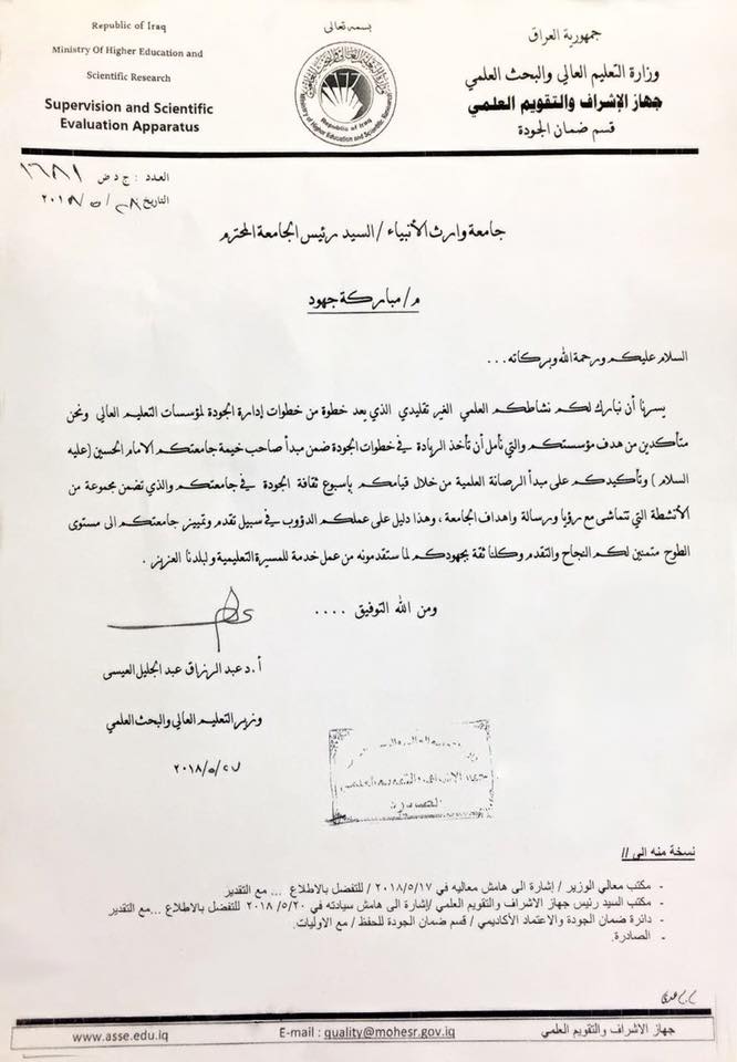 وزير التعليم العالي والبحث العلمي يقدم مباركة لجهود جامعة وارث الانبياء في اسبوع ضمان الجودة في الجامعة