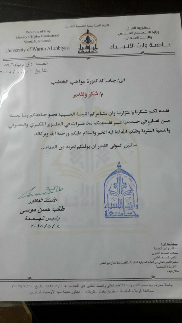 بادر رئيس جامعة وارث الانبياء الدكتور طالب الموسوي الى توجيه كتاب شكر وتقدير الى مسؤولة قسم التطوير الفكري والمعرفي في الجامعة ,حمل في مضمونه أسمى ايات الشكر والتقدير لجهودها المبذولة وعطاءها الكبير حيث سيكون هذا التكريم دافع وحافز لبذل المزيد من العطاء في خدمة جامعتنا والعلم والطلاب,وذكر رئيس الجامعة في الكتاب أننا متمنين من الله العلي القدير التوفيق والسداد لها لما تقدمه من دور ايجابي وتفاني من خلال محاظرات التنمية البشرية والتطوير الفكري و المعرفي.