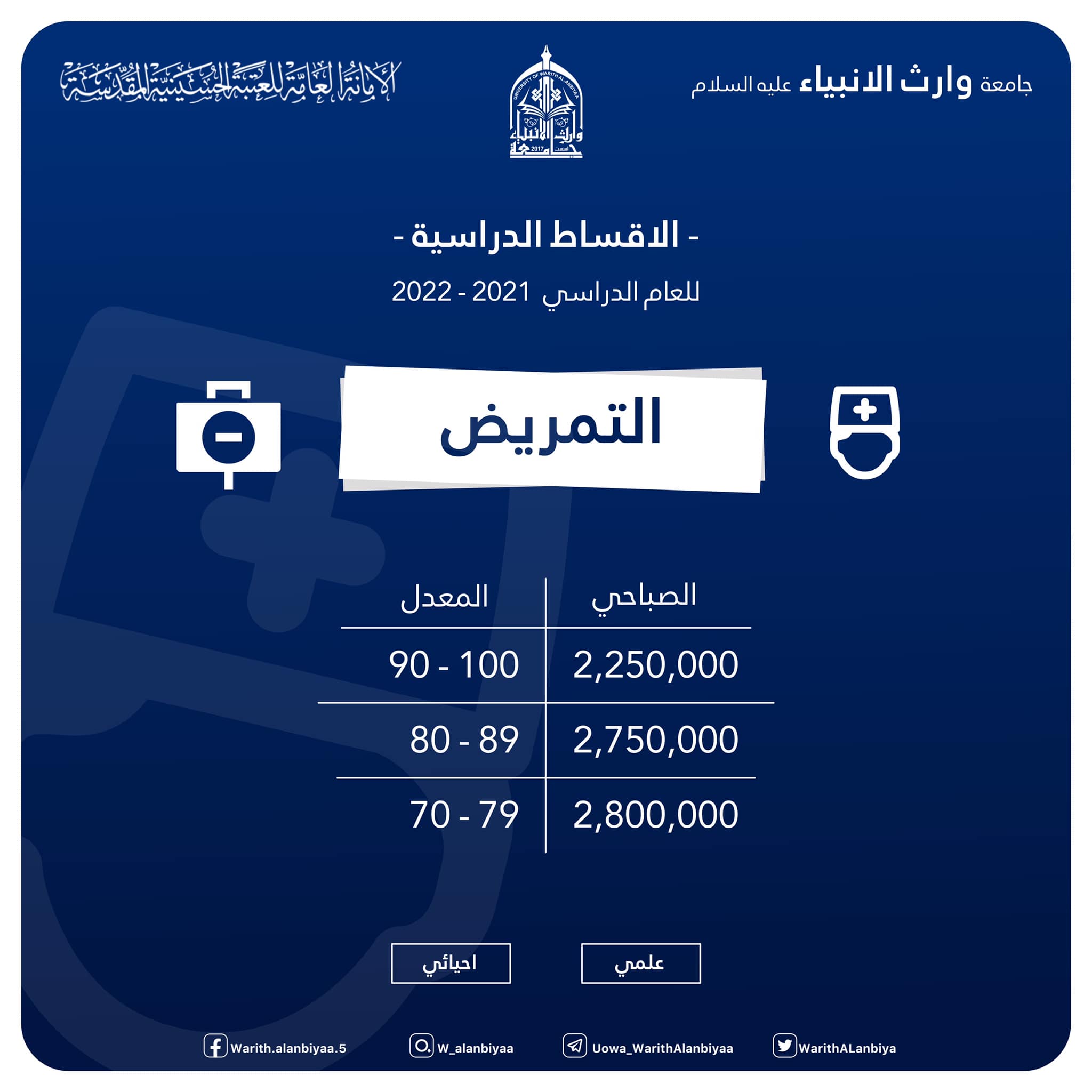 الحد الادنى للقبول 70فرع الدراسة الإعدادية -علمي-احيائي- اعدادية التمريض نوع الدراسة-صباحي فقطالأقساط الدراسية -حسب المعدل التدريب السريري والصيفي -مستشفى الإمام زين العابدين (عليه السلام)*التعيين للطلبة الاوائل في مؤسسات العتبة الحسينية المقدسة الاولوية في تعيين كل خريجي كلية التمريض جامعة وارث الانبياء (عليه السلام) في مؤسسات العتبة الحسينيه الطبية.