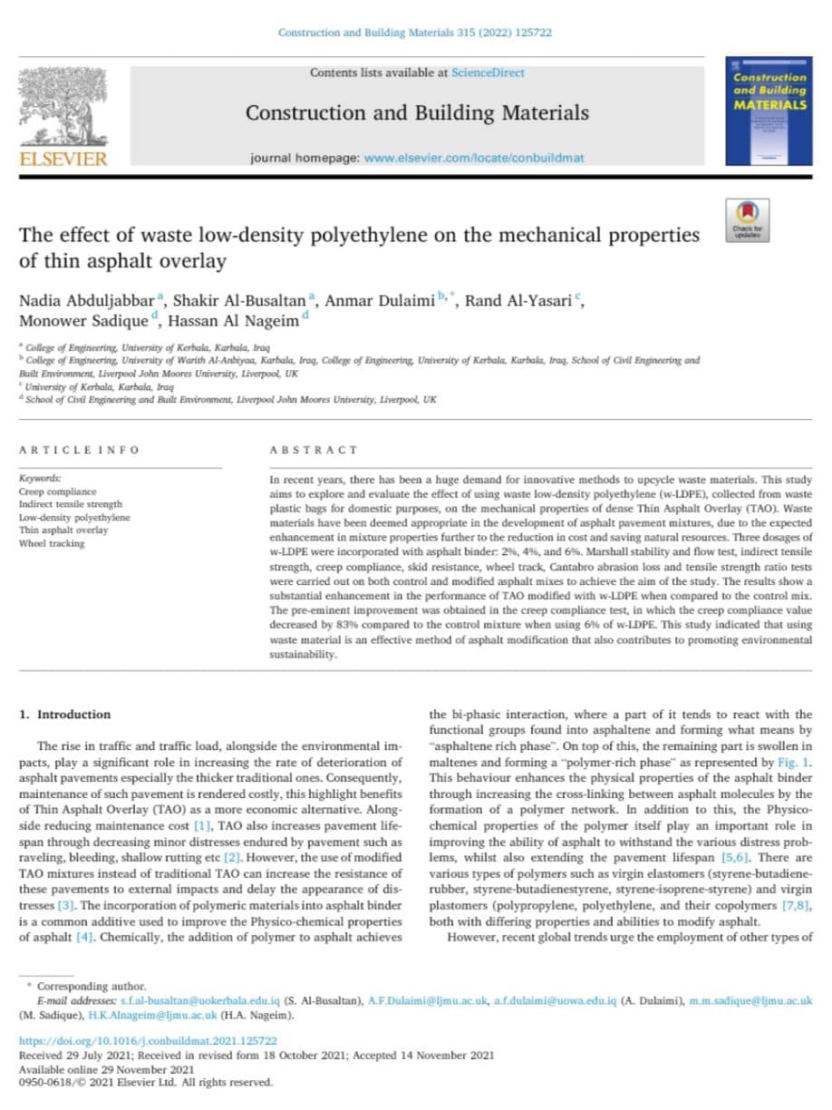يسعى باحثو جامعة وارث الانبياء(عليه السلام) الى تطوير البحث العلمي من خلال دخول بوابة النشر العلمي الرصين والنشر في مجلات مصنفة عالمياً. ومن أجل تعزيز سمعة جامعتنا في النشر العلمي الرصين، تم نشر بحث للأستاذ المساعد الدكتور انمار ديكان من كلية الهندسة في واحدة من أفضل المجلات العالمية الخاصة بنشر البحوث الهندسية وهي مجلة: (Construction and Building Materials Journal) هذه المجلة تصدر في المملكة المتحدة عن دار النشر السفير (Elsevier) وهي مصنفة من الصنف الأول (Q1) ولها معامل هيرتش ((H-index 170 وذات معامل تأثير (Impact Factor: 6.141) ولها سايت سكور ( (CiteScore: 8.8 ومصنفة ضمن مستوعبات سكوباس وكلاريفيت. هذه المجلة تقع في المرتبة 7 من مجموع 136 مجلة بتخصص: ( (Engineering, Civilمصنفة ضمن موقع: (Scimago Journal & Country Rank)عنوان البحثThe Effect of Waste Low-Density Polyethylene on the Mechanical Properties of Thin Asphalt Overlayللحصول على البحث مجانا https://authors.elsevier.com/a/1e9s%7E3O1E1Mu15