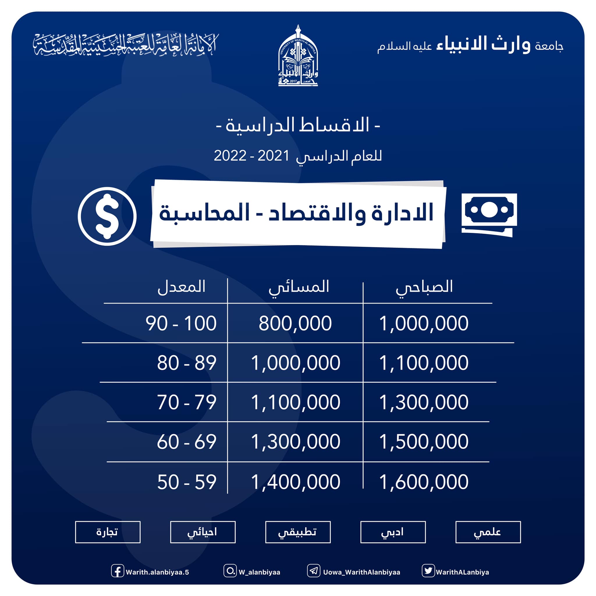 اليكم المعلومات التالية :*التعيين للطلبة الاوائل في مؤسسات العتبة الحسينية المقدسة كلية الإدارة والاقتصاد تضم قسمين: قسم المحاسبة-قسم ادارة الأعمالالحد الادنى للقبول 50فرع الدراسة الإعدادية - تطبيقي-علمي -احيائي-تجارةنوع الدراسة-صباحي -مسائيالأقساط الدراسية -حسب المعدل