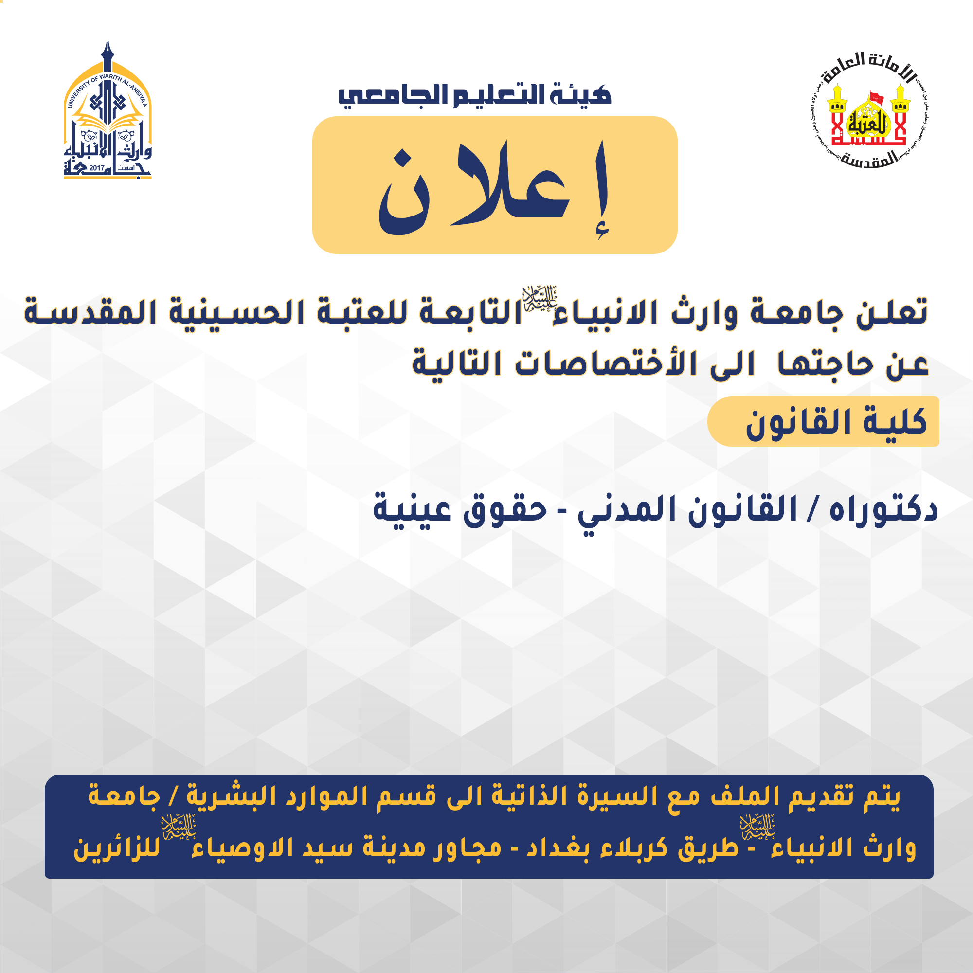 تعلن جامعة وارث الانبياء(عليه السلام) عن حاجتها الى (درجة وظيفية) على ملاك كلية القانون لحملة الشهادات العليا
