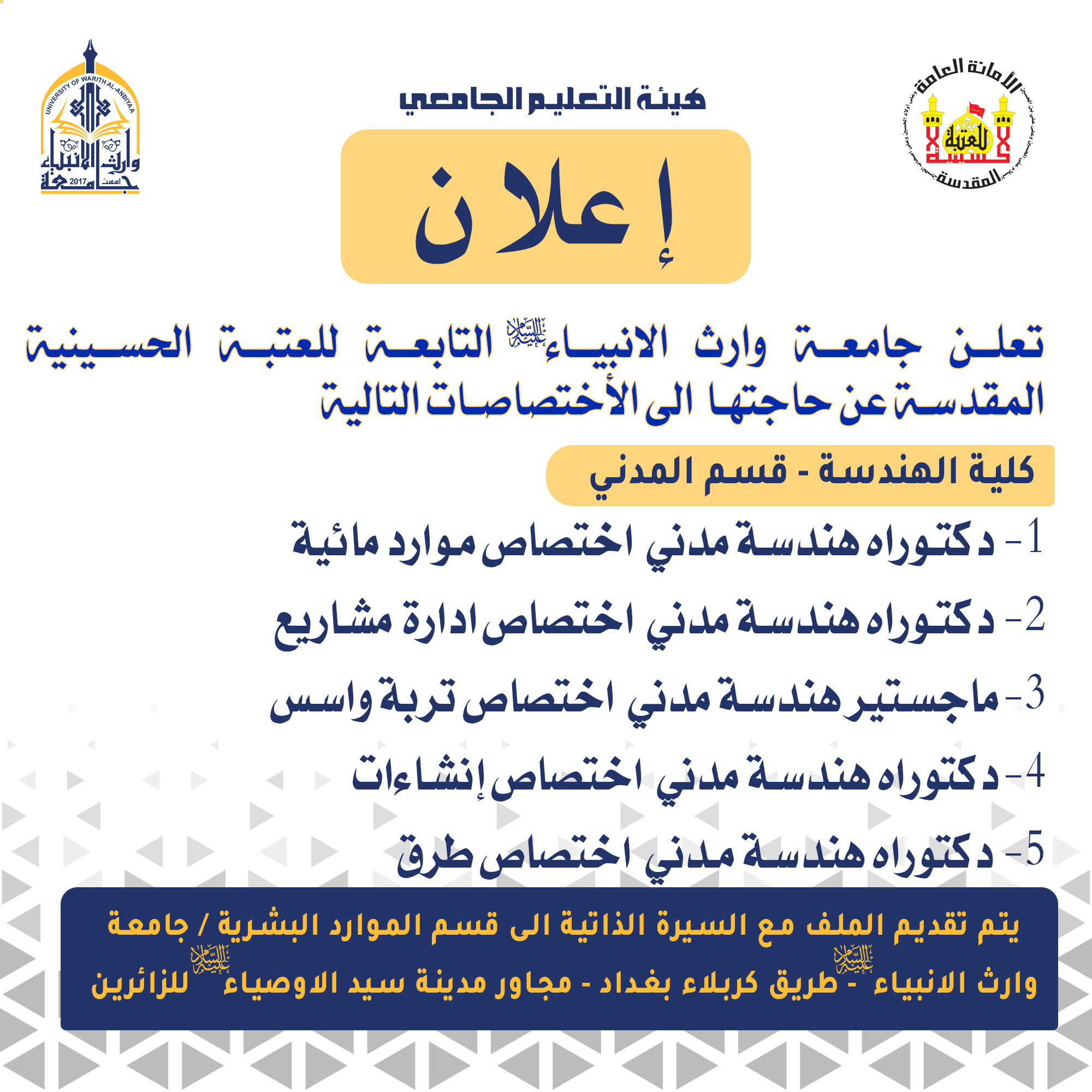 تعلن جامعة وارث الانبياء(عليه السلام) عن حاجتها الى درجات وظيفية ضمن الملاك التدريسي في كلية الهندسة